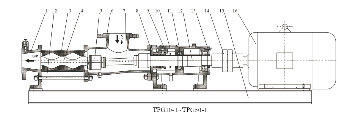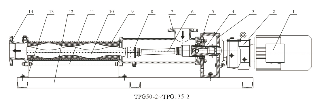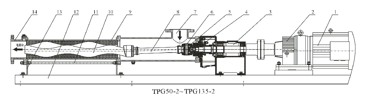१.मोटर २.गियरबॉक्स B. बेअरिंग फ्रेम घटक Pac. पॅकिंग सील घटक ex. एक्सटेंशन शाफ्ट Union. युनिव्हर्सल संयुक्त घटक S. सॉक्शन चेंबर 8. कॉन्टेक्टिंग रॉड 9.स्टेटर १०. स्टेटर १०. टाय रॉड १२.बेस १ .. समर्थन फूट १ ..